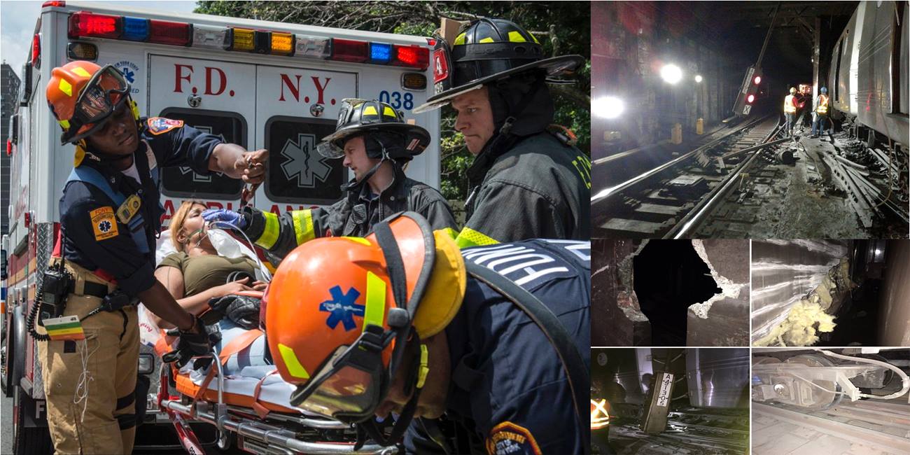 El tren, que se descarriló parcialmente, estrellando parte de su estructura contra una de las paredes de la estación, después que se rompiera el gaje de seguridad del cabeza del vagón delantero, según NY1 News, sufrió daños estructurales de consideración.