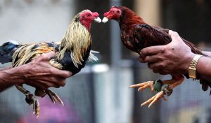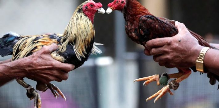 Los gallos generalmente están equipados con herramientas afiladas en sus patas y se ven obligados a luchar entre sí hasta que uno es asesinado o incapaz de continuar.