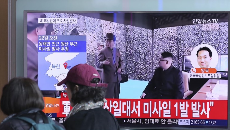 Visitors walk by the TV screen showing the news program with a file footage of North Korean leader Kim Jong Un at the Seoul Train Station in Seoul, South Korea, Wednesday, March 22, 2017. North Korea’s latest missile launch ended in failure on Wednesday, the U.S. and South Korean militaries said, three days after the North claimed a major breakthrough in its rocket development program. The letters read «Launch a missile» (AP Photo/Lee Jin-man)