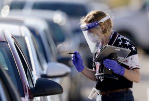 Una funcionaria electoral da instrucciones a un conductor en un punto de votación en Kansas City, Kansas,