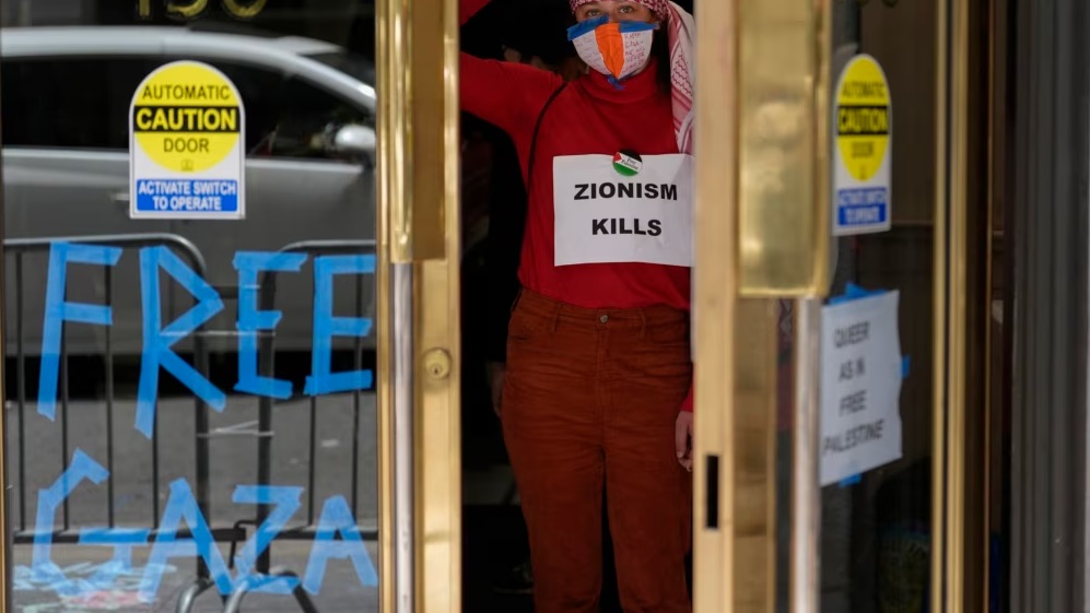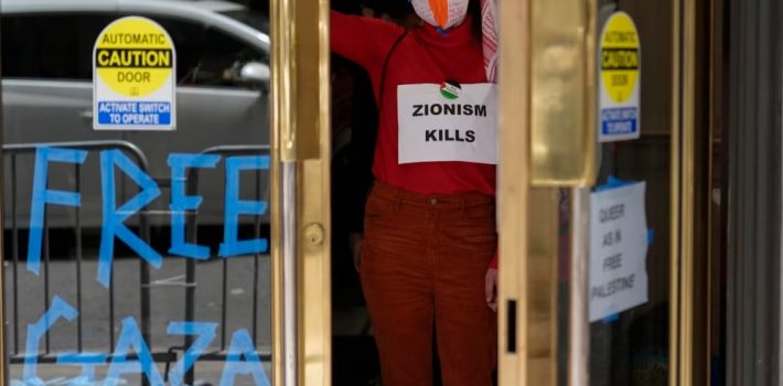 Un grupo de manifestantes ingresó al edificio el lunes y lo ocupó durante varias horas. Los inconformes colocaron pancartas en la puerta principal del lugar en las que exigían el fin de la guerra entre Israel y Hamás.