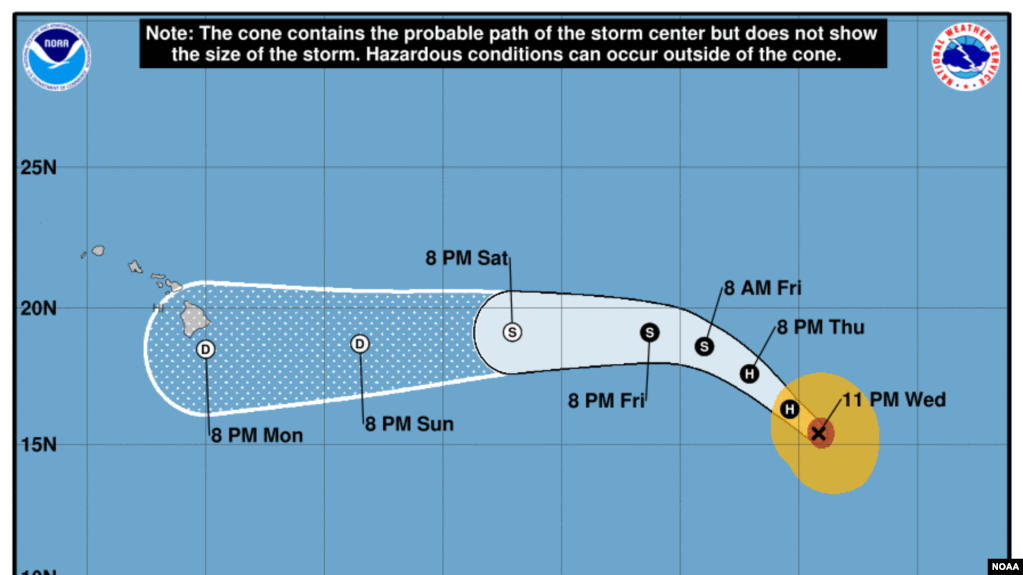 El vórtice de la tormenta se ubica a unos 2.870 kilómetros (1.745 millas) al este de Hilo, Hawai, y avanza con dirección oeste-noroeste a 19 km/h (12 mph), informó el Centro Nacional de Huracanes de Estados Unidos.