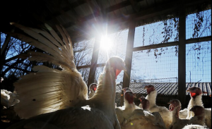 Pavos en su granero en Seven Acres Farm en North Reading, Massachusetts, EE.UU.