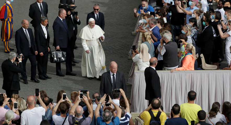 El Papa Francisco llega para su audiencia general, la primera en presencia de fieles desde febrero