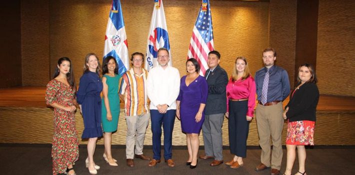 Santo Domingo, D.N.- El encargado de Negocios de la Embajada de los Estados Unidos en la República Dominicana, Robert Thomas, juramentó a once nuevos técnicos voluntarios del Cuerpo de Paz, el primer grupo nuevo que inicia sus labores luego de la pausa causada por la pandemia del COVID-19.