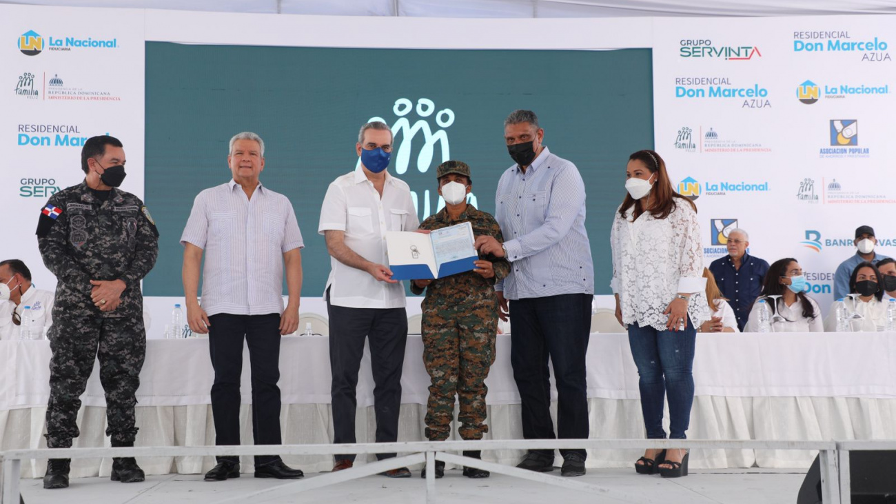 Azua. – El presidente Luis Abinader y el ministro de la Presidencia, Lisandro Macarrulla, entregaron este sábado 80 apartamentos a igual número de beneficiarios, lo que impactará positivamente y elevará la calidad de vida de alrededor de 400 personas en Azua, con lo que se completa la segunda entrega de soluciones habitaciones del Plan Nacional de Viviendas Familia Feliz.