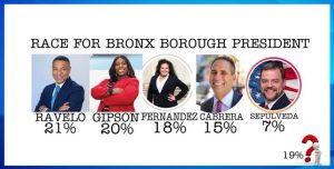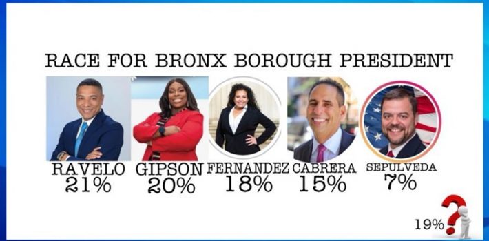 Ravelo, un ex teniente del Departamento de la Policía de NY y ex veterano de la guerra de Irak, obtuvo entre los 300 encuestados, un 21% de simpatía; luego la concejal Vanessa Gibson un 20%; Nathalia Fernández un 18%; el concejal Fernando Cabrera un 15%; y el senador estatal Luis Sepúlveda un 7%.