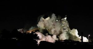 La estructura restante tardó unos segundos en caer después de que se desencadenara la demolición alrededor de las 10:30 p.m. hora local. Una nube de polvo y escombros se elevó y permaneció en el cielo durante unos minutos después.