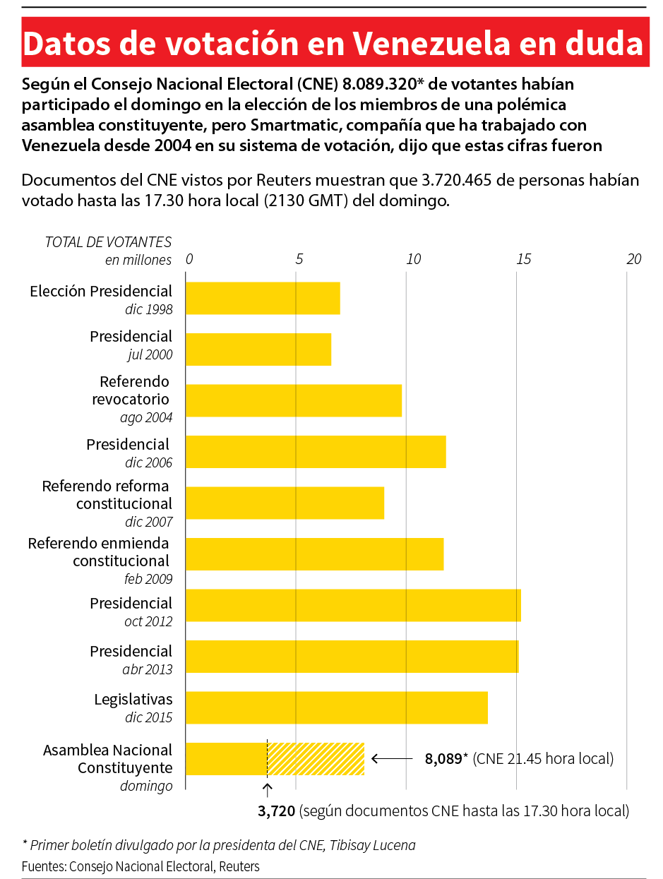 El dato de participación era clave para la legitimidad de la Constituyente, luego de que la oposición aseguró haber recaudado 7,6 millones de votos contra la iniciativa en un plebiscito simbólico celebrado el 16 de julio