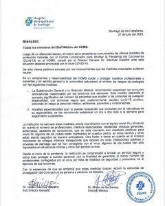 SANTIAGO,-El Hospital Metropolitano de Santiago (HOMS), suspendió desde este lunes y por las próximas dos semanas las consultas médicas presenciales, argumentando que busca evitar el contagio de coronavirus entre sus profesionales y pacientes.