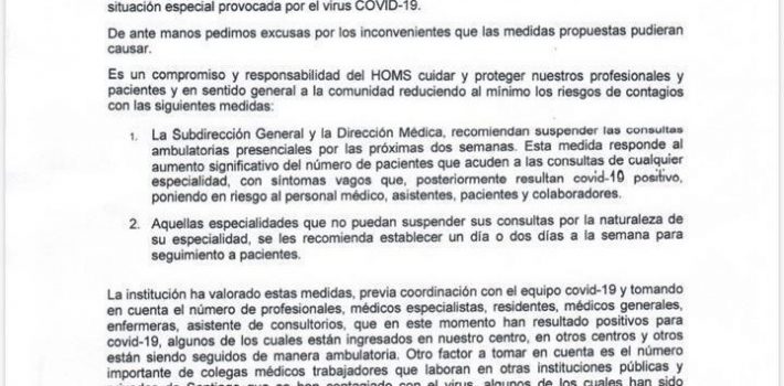 En una carta dirigida a los médicos que prestan servicios en el centro de salud, la Dirección Médica del Hospital explica que quedan excluidos de la medida los galenos cuyas especialidades les impida dejar de atender a sus pacientes, aunque les recomienda verlos un día o dos por semana para fines de seguimiento.