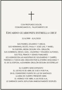 Según un comunicado emitido por la familia, las honras fúnebres se llevarán a cabo en el cementerio Fuente de Luz de Santiago, donde los restos del joven serán expuestos desde las 5:00 hasta las 9:00 de la noche. El viernes 11 de abril, a las 10:00 de la mañana, se celebrará una misa de cuerpo presente, seguida de su cristiana sepultura.