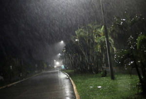 La lluvia azota una calle cuando se acerca el huracán Eta en Tela, Honduras
