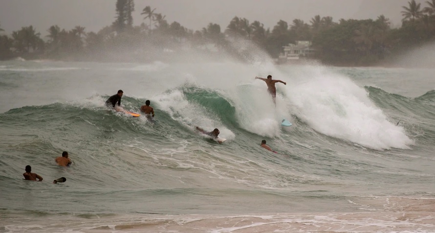 Surfistas enfrentan grandes olas generadas por el huracán Douglas en Laie Beach Park, en Laie, Hawái, el domingo, 26 de julio de 2020.