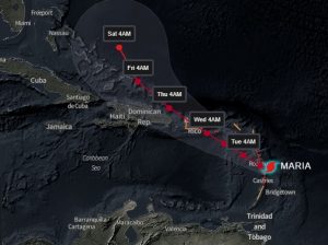 El Centro Nacional de Huracanes dijo que María tenía vientos máximos sostenidos de 200 mph (125 mph) el lunes por la tarde. Se centró a unos 45 kilómetros (70 kilómetros) al este-noreste de Martinica – o 70 millas (115 kilómetros) al este-sureste de Dominica – y rumbo al oeste-noroeste a 17 km.