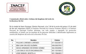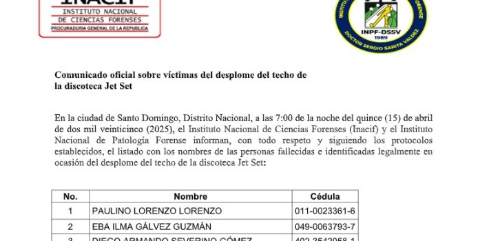 El Instituto Nacional de Ciencias Forenses (Inacif) y el Instituto Nacional de Patología Forense confirmaron la identidad de 230 personas fallecidas en el colapso del techo de la discoteca Jet Set, ocurrido el pasado 7 de abril en Santo Domingo. Este trágico incidente, considerado uno de los más graves en la historia reciente del país, ha generado una profunda conmoción a nivel nacional.