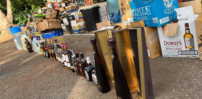 La incautación incluyó 186 cajas de varias marcas y tipos de bebidas alcohólicas, totalizando 1,780 unidades, seis botellas de tequila Don Julio, un galón de vino «La Fuerza», 24 galones de alcohol etílico, y 16 tanques de líquidos químicos de color azul.