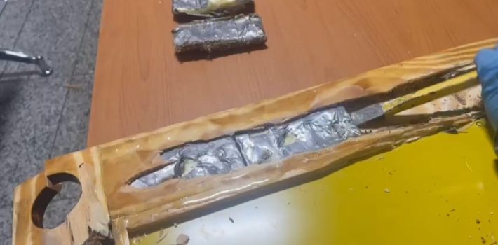 En presencia de un fiscal se procedió a abrir la caja, encontrando dentro una mesa de jugar dominó, en cuyos laterales se ocuparon 16 láminas de cocaína, incrustadas entre la madera, con un peso aproximado a los dos kilogramos.