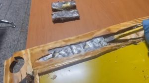 En presencia de un fiscal se procedió a abrir la caja, encontrando dentro una mesa de jugar dominó, en cuyos laterales se ocuparon 16 láminas de cocaína, incrustadas entre la madera, con un peso aproximado a los dos kilogramos.