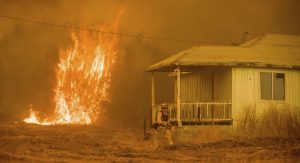 Flames rise behind a vacant house as a firefighter works to halt the Detwiler near Mariposa, Calif., on Wednesday, July 19, 2017. According to fire officials, the blaze has scorched more than 45,000 acres and destroyed at8 structures. (AP Photo/Noah Berger)
