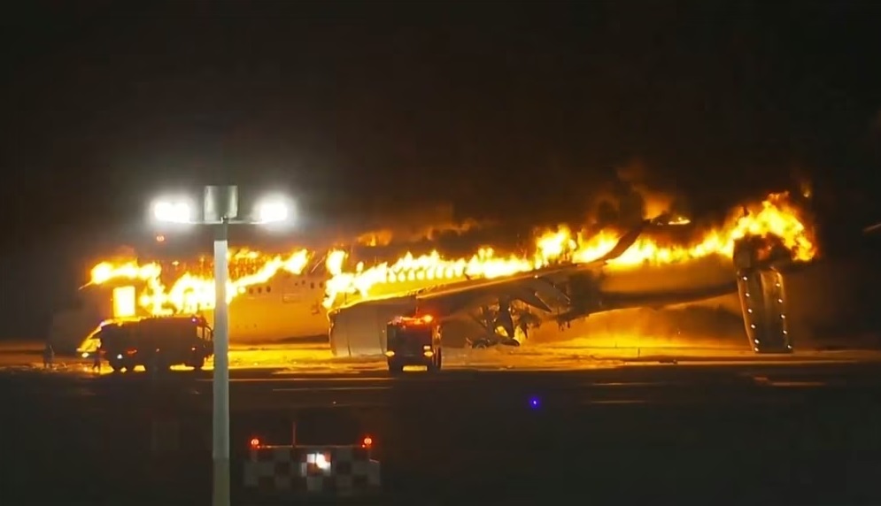 En imágenes de la televisión local fue posible ver cómo el fuego y humo envolvían un costado del avión de Japan Airlines mientras se desplazaba por una pista. Luego se incendió el área alrededor del ala. Una hora después, las tomas mostraban el fuselaje totalmente en llamas.