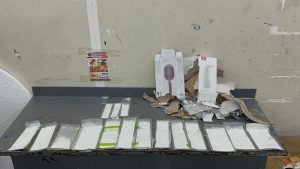 En operativos de inspección, realizados en los depósitos del Inposdom, agentes de la DNCD, coordinados por fiscales y apoyados por unidades caninas, detectaron sustancias extrañas en varios paquetes cargados de juguetes, envases plásticos y utensilios para salón de belleza.