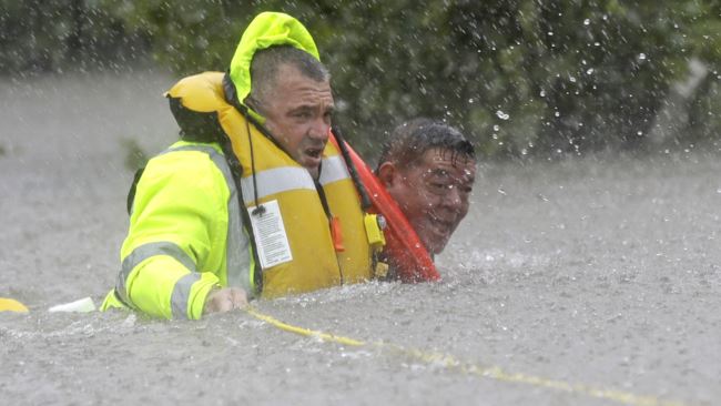 Equipos de voluntarios se sumaron al personal de emergencias para sacar a gente de su casa o de áreas inundadas, tantas que las autoridades tenían problemas para identificar las zonas más afectadas. Instaron a la gente a salir a los tejados de sus casas para no quedarse atrapada en los áticos, y a ondear sábanas o toallas para llamar la atención sobre su ubicación.