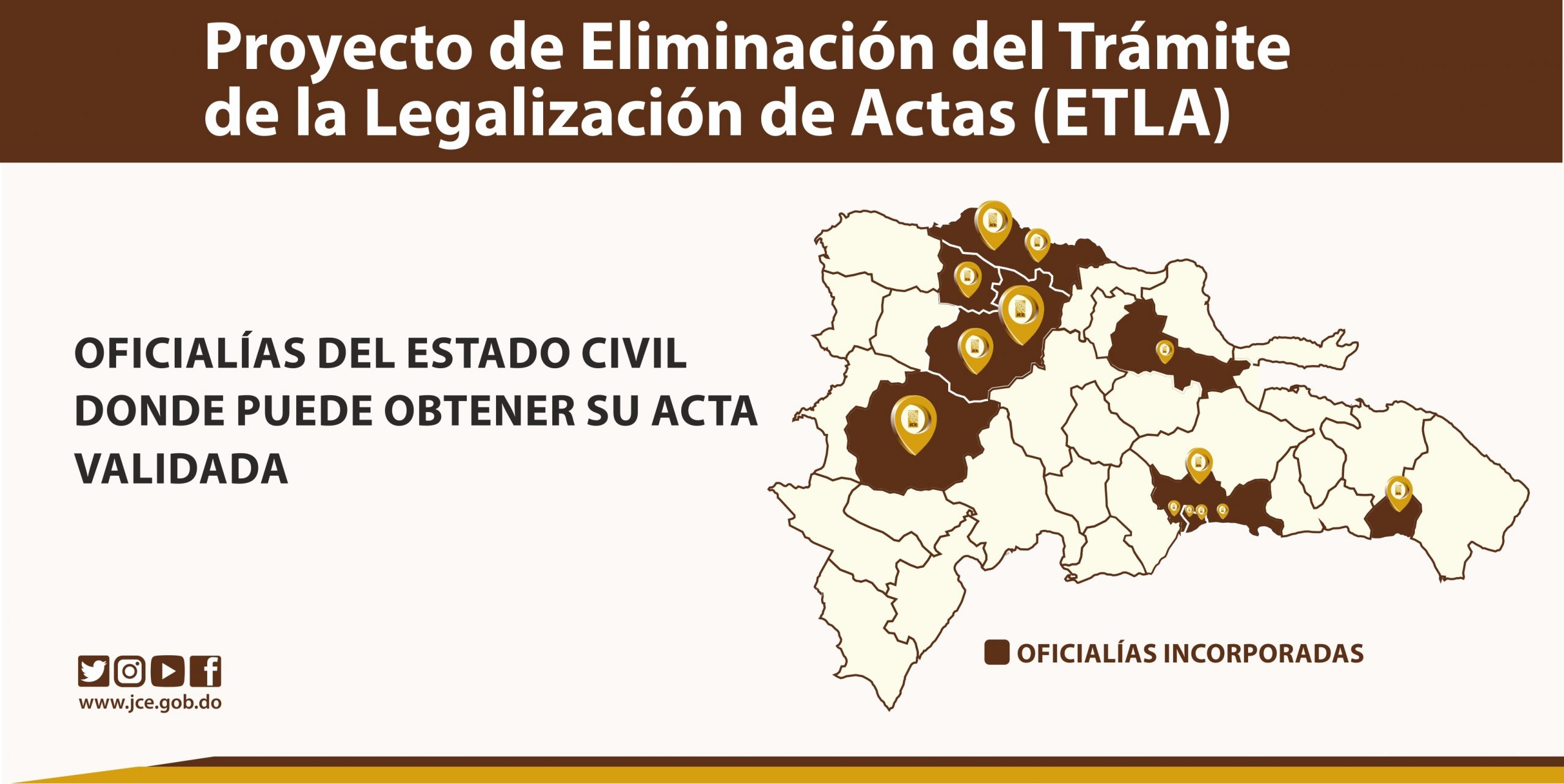 La Junta Central Electoral (JCE) anunció para este martes la incorporación de otras nueve Oficialías del Estado Civil a la implementación gradual del Proyecto de la Eliminación del Trámite de la Legalización de las Actas del Estado Civil (ETLA).