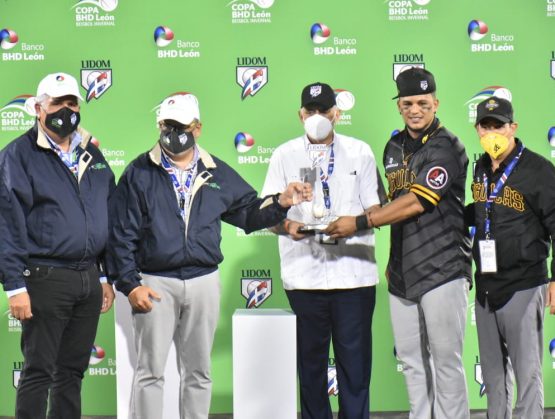 Luis Lembert y José Enrique Canoja, ejecutivos del Banco BHD León entregaron la Copa de Campeón al señor Vitelio Mejía, presidente de la Liga Dominicana de Béisbol (Lidom), quien hizo lo propio a Kilvio Hernández y a Félix Fermín, presidente y dirigente, respectivamente, de las Águilas, así como a los jugadores Juan Carlos Pérez y Francisco Peña.