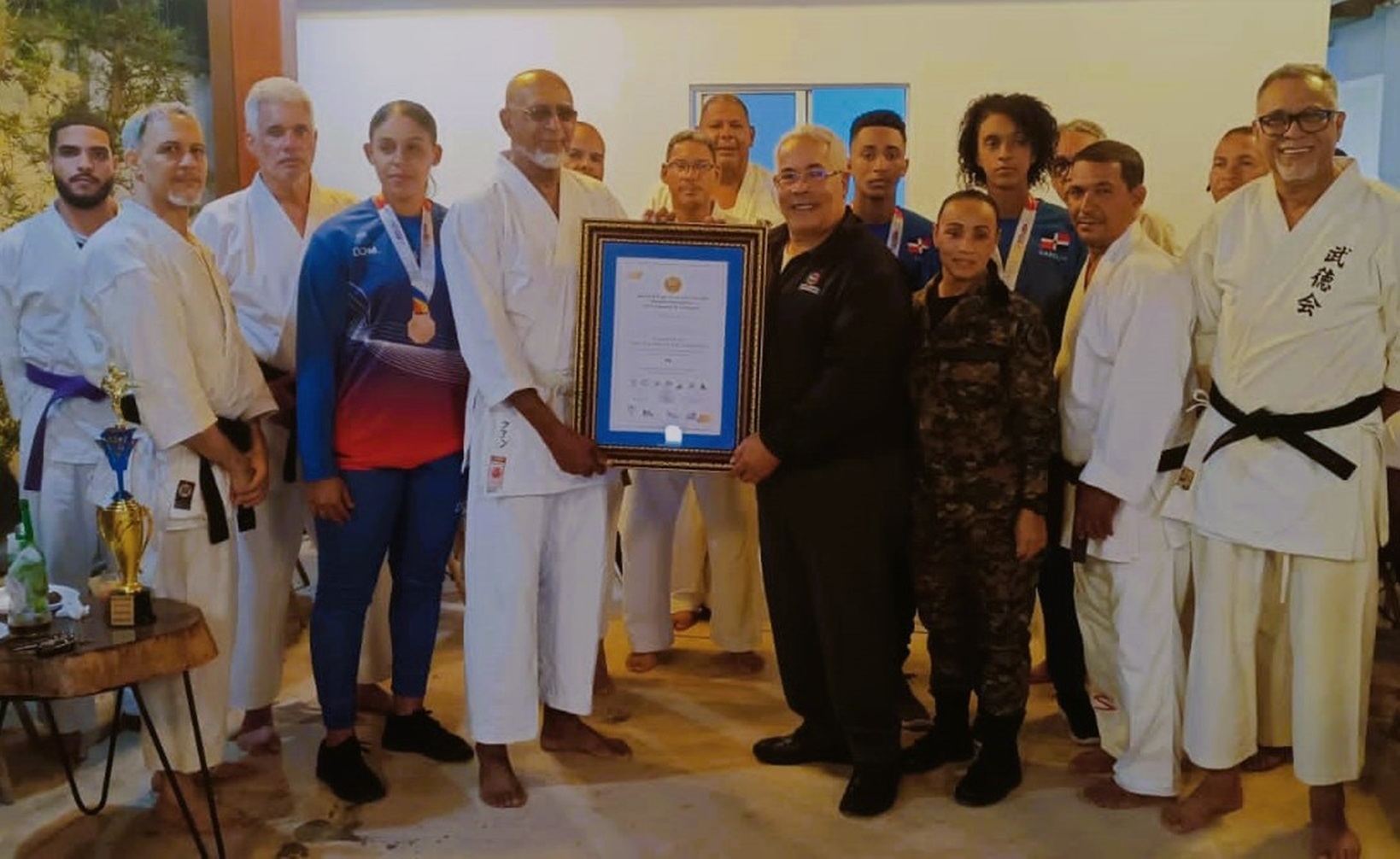 En la actividad realizada recientemente en el club del empresario telefónico Miguel Alfonso, el cual estuvo lleno de emoción, el maestro Chuchú Cruz, recibió la distinción de manos del profesor Ramírez y del sensei Severiano Rosa, presidente de la Asociación de Karate de Santiago.