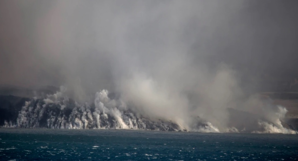 El encuentro entre la cascada de roca fundida y el agua del mar se produjo a las 23:00 horas del martes. Al amanecer podía verse un nuevo promontorio bajo las nubes de vapor que cubrían la zona.