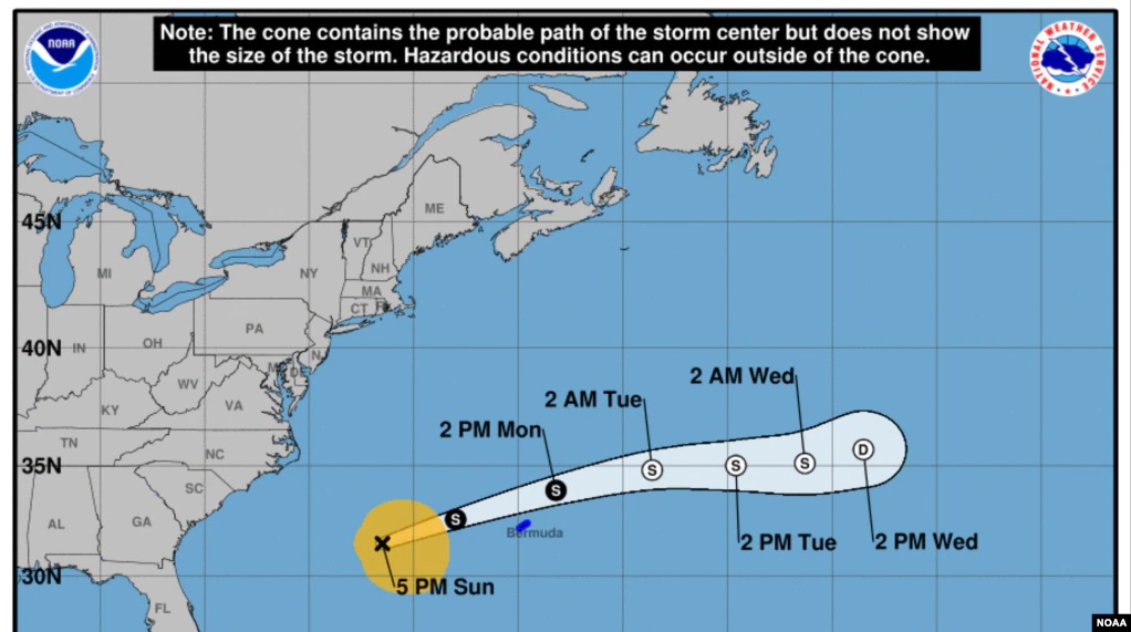 Los meteorólogos estimaban que pasaría el lunes justo al norte de Bermuda. La isla activó un aviso por tormenta tropical, entre previsiones de 2,5 y 5 centímetros (1 a 2 pulgadas) de lluvias entre el domingo por la noche y el lunes.