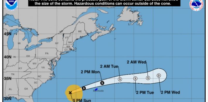 Los meteorólogos estimaban que pasaría el lunes justo al norte de Bermuda. La isla activó un aviso por tormenta tropical, entre previsiones de 2,5 y 5 centímetros (1 a 2 pulgadas) de lluvias entre el domingo por la noche y el lunes.