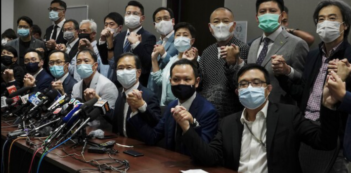 Un grupo de 15 legisladores prodemocracia de Hong Kong anunciaron el miércoles 11 de noviembre, en una conferencia de prensa, su renuncia en masa después de que el gobierno semiautónomo del territorio chino descalificó a cuatro de sus colegas del Parlamento.