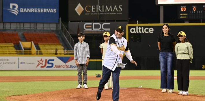 Santiago.- El presidente ejecutivo del Banco de Reservas, doctor Leonardo Aguilera, realizó este miércoles el lanzamiento de la primera bola del partido inaugural de la temporada 2025-2026 de la Liga Dominicana de Béisbol (LIDOM), efectuado en el Estadio Cibao, donde se enfrentaron las Águilas Cibaeñas y los Gigantes del Cibao.