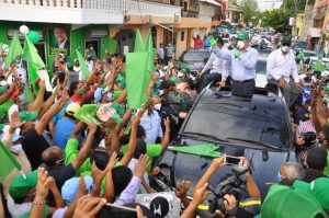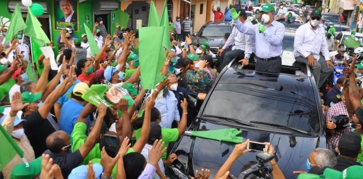 Miles de ciudadanos con sus mascarillas puestas abarrotaron las calles de los municipios de Santo Domingo Este y Norte, en donde se observó a hombres, mujeres y jóvenes en los balcones con banderas y pancartas alusivas al líder de la Fuerza del Pueblo.