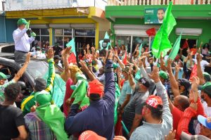 En Espaillat, fue recibido por cientos de personas que lanzaban consignas, exhibían todo tipo de prendas verdes y demás objetos en apoyo al líder de la FP y los candidatos a diputados y senadores del partido y fuerzas aliadas.