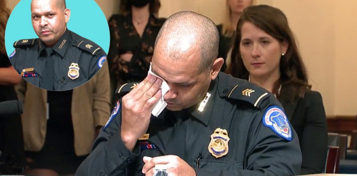 Dijo a los investigadores de la Cámara de Representantes que podía sentir que estaba perdiendo oxígeno cuando fue aplastado por los supremacistas, partidarios de Trump, mientras trataba de contenerlos y proteger al capitolio y los legisladores.