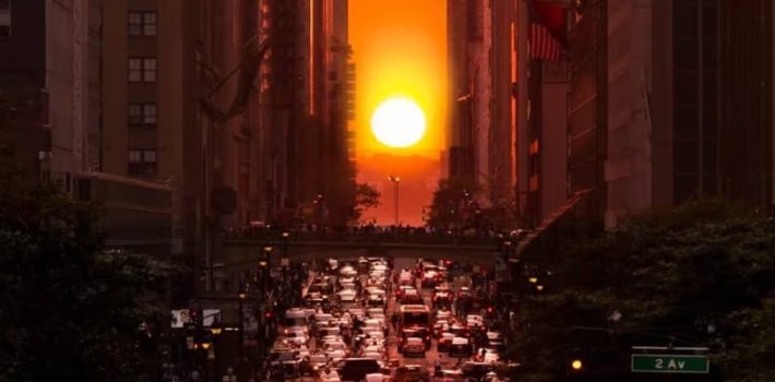 El Manhattanhenge ocurre en la Gran Manzana cuando la puesta del sol se alinea exactamente con la cuadrícula de calles de Manhattan de este a oeste, creando un espectáculo visual único al atardecer.