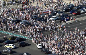Rusia dijo que ofrecería ayuda militar a Lukashenko si fuera necesario, pero no hubo presencia policial visible en la protesta, que atrajo a unas 200.000 personas, según la estimación de un reportero de Reuters. Al menos dos manifestantes han muerto y miles han sido detenidos en una ofensiva popular desde la votación.