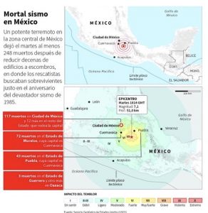 La agencia de Protección Civil indicó el miércoles por la mañana que la cifra de muertos confirmados había subido a 248 personas, más de la mitad en la capital.