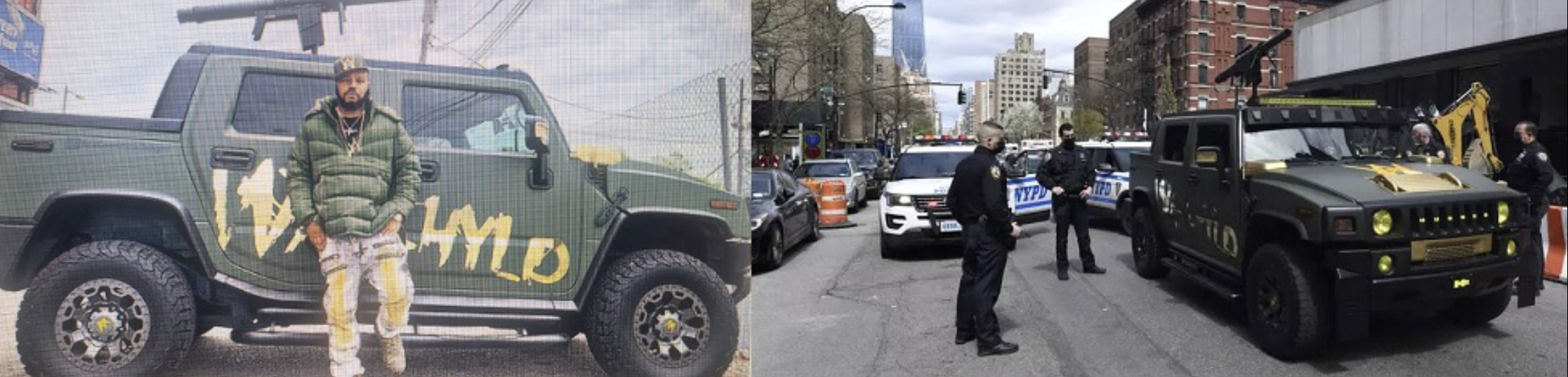 Mientras, en la capital del mundo (NYC), el rapero de Filadelfia, Chris Stoney (Warchyld) recorrió este domingo la calle 14 con la Novena avenida en Downtown Manhattan, con una bazuca encima de su jeepeta Hummer.