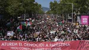 Barcelona, España.– Decenas de miles de personas se manifestaron este sábado por el centro de Barcelona para exigir el fin del “genocidio” israelí en Gaza y mostrar su rechazo al asalto a la Global Sumud Flotilla, en una marcha masiva que congregó a unas 70.000 personas, según datos del Ayuntamiento de Barcelona, y a 300.000, de acuerdo con los organizadores.