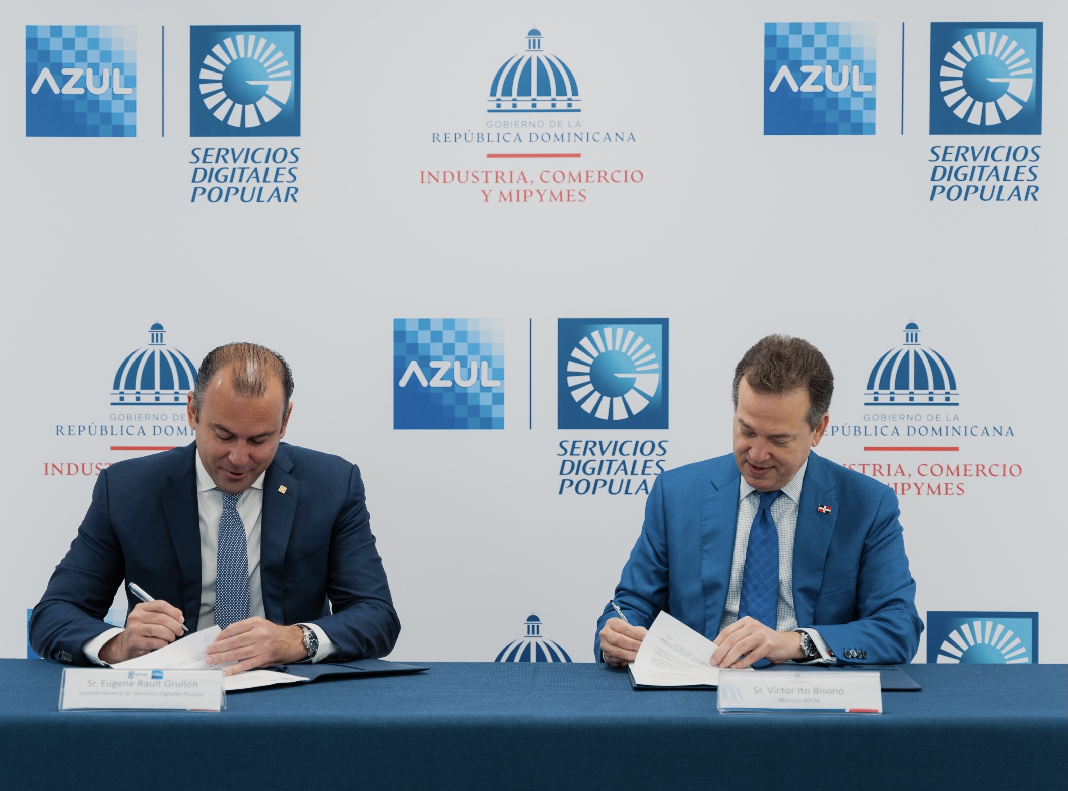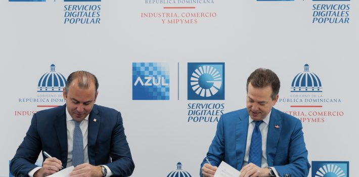 Santo Domingo, D.N. – El Ministerio de Industria, Comercio y Mipymes (MICM) y AZUL, la marca comercial de Servicios Digitales Popular, filial de Grupo Popular, facilitarán la inserción y el desarrollo de medios de pagos y transacciones digitales en las pequeñas y medianas empresas que cuenten con la Certificación Mipymes que otorga este ministerio.