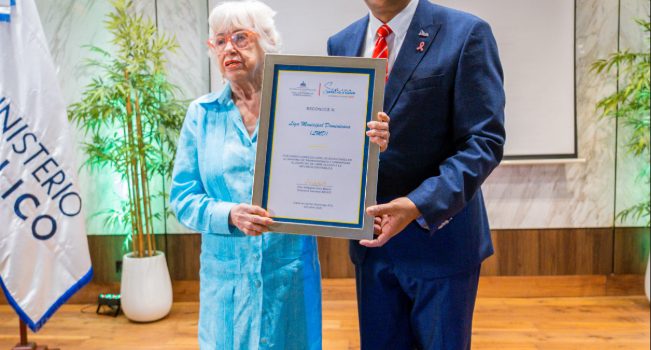 Santo Domingo.– La directora general de Ética e Integridad Gubernamental (DIGEIG), Milagros Ortiz Bosch, entregó un reconocimiento al presidente de la Liga Municipal Dominicana (LMD), Víctor D´Aza, por el cumplimiento de los más altos estándares de transparencia en su portal institucional y por garantizar el derecho ciudadano al libre acceso a la información pública.