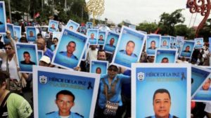 Los partidarios del presidente de Nicaragua, Daniel Ortega, muestran fotos de policías muertos, que perdieron la vida durante las últimas protestas, en una manifestación en Managua, Nicaragua el 21 de julio de 2018. REUTERS / Jorge Cabrera –