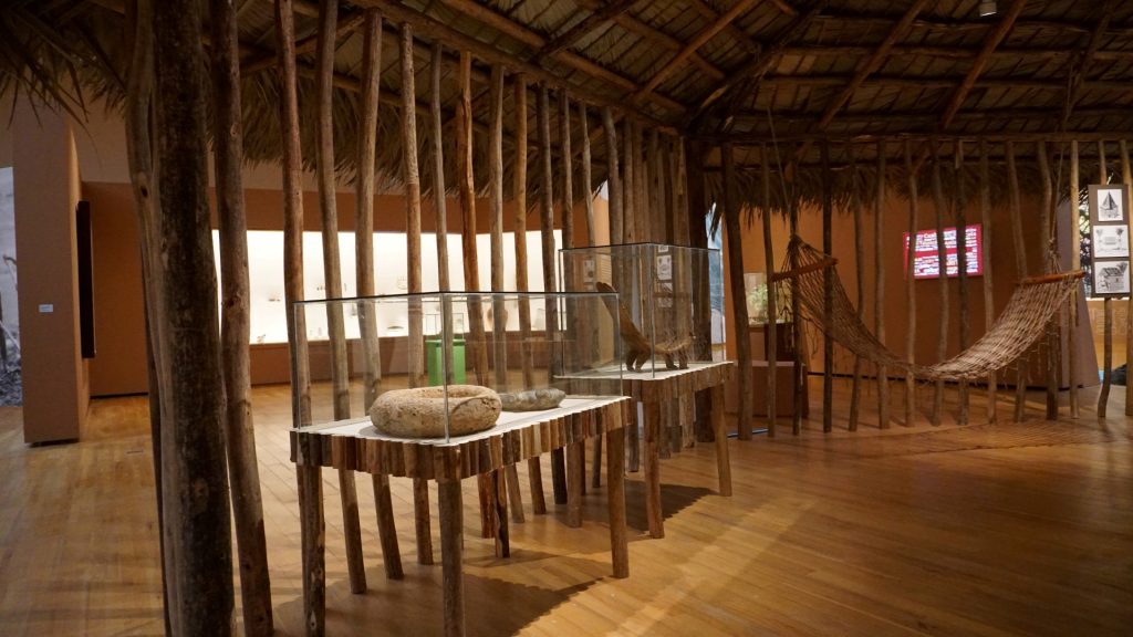 Cinco ámbitos reflejan los aspectos de la vida taína, a través de 150 piezas realizadas en piedra, barro, concha y hueso: potizas, vasijas, trigonolitos, hachas, ralladores, amuletos, ollas, vasos, majadores ceremoniales, aros, collares, y maracas.