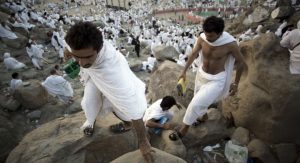 Muslim pilgrims climb Jabal Al Rahma holy mountain, or the mountain of forgiveness, at Arafat for the annual hajj pilgrimage, outside the holy city of Mecca, Saudi Arabia, Thursday, Aug. 31, 2017. (AP Photo/Khalil Hamra)