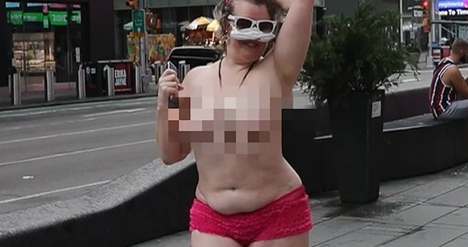 Mujer semi desnuda se pasea próximo consulado RD-NY