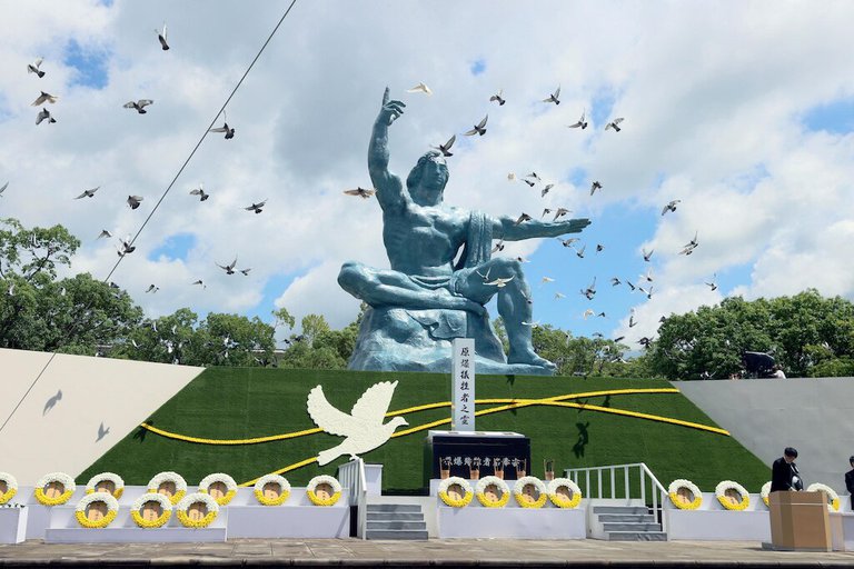 En su discurso en el Parque de la Paz de Nagasaki, el alcalde Tomihisa Taue instó al gobierno de Japón a tomar la iniciativa en la creación de una zona libre de armas nucleares en el noreste de Asia en lugar de permanecer bajo el paraguas nuclear de Estados Unidos, una referencia a la promesa de Estados Unidos de usar sus propias armas nucleares para defender a los aliados sin ellos.
